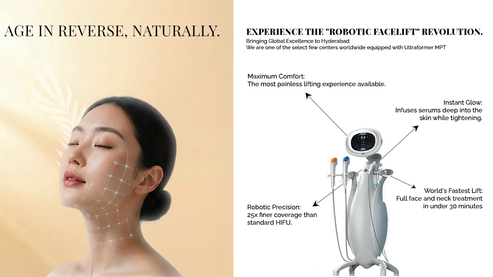 Cosmo Radiance is a 15,000 sq. ft. premium aesthetic hospital in Miyapur, proudly housing the genuine, FDA-cleared 4th Gen Ultraformer MPT. While commercial clinics in Hyderabad rely on outdated, generic HIFU devices, our MPT system represents a technological leap forward. As India's leading aesthetic center, our exclusive 'MP Mode' delivers energy 25 times faster, ensuring a safe, rapid, and clinical experience for patients visiting from Jubilee Hills, Gachibowli, Hitech City, and beyond.